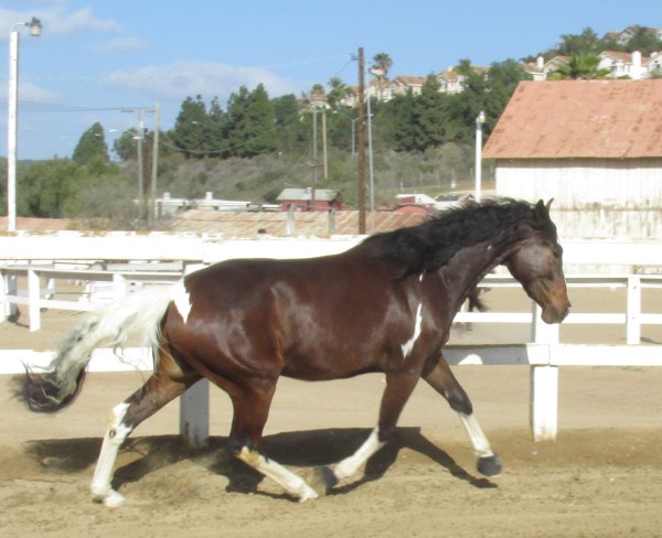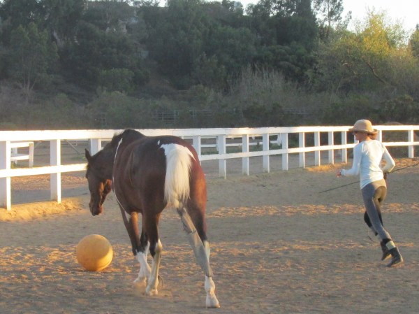 I used a mat for Wiley’s “mark” and started by just leading him up to it. When he put both feet on the mat, I rewarded him. It didn’t take long before he got the idea. Next, I free longed him, gave the command “mark” and removed the driving aids. Wiley came in to the mat. It took Wiley a few attempts to understand that BOTH feet had to be on the mat for the reward, but I just hung out and waited. He eventually figured it out. When he was consistent at going onto the mat, I took him to the other end of the arena and gave the command “mark.” You can see his first attempts on the video below. By the way… the video and the still shot were taken by my little 8 year old man Karsten. He’s getting pretty good!