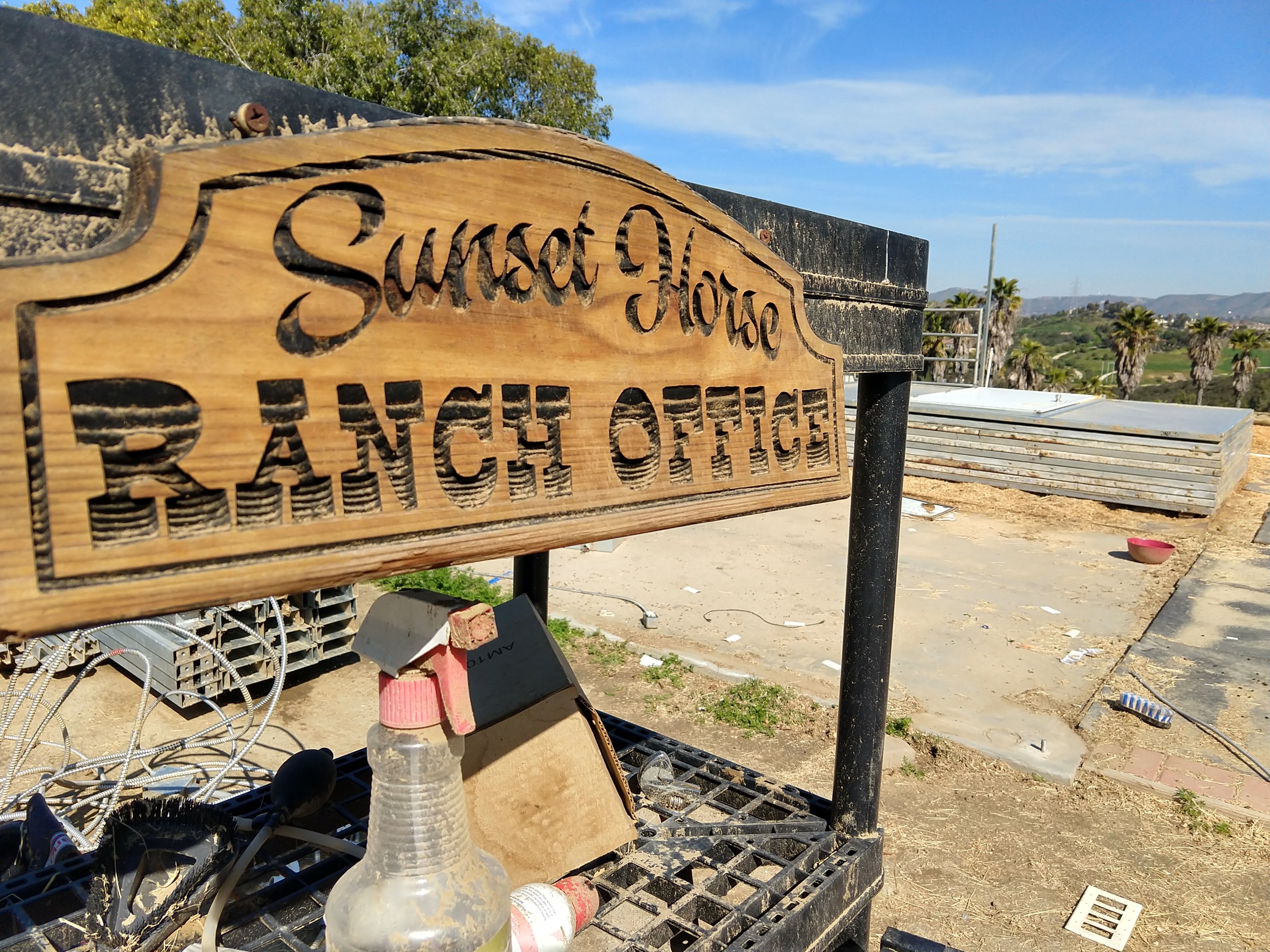 Ranch office sign in a trash pile